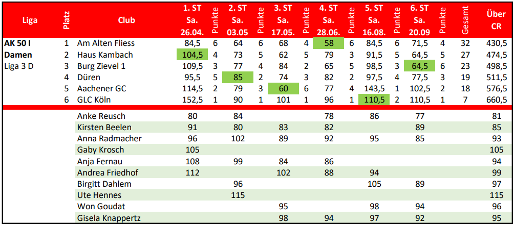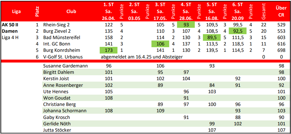 Die AK 50 der Damen schaffte am letzten Spieltag den Sprung von Platz 2 auf Platz 1 und steigt somit in die 3. Liga auf. Mit einem Punkt Rückstand und 17 Schlägen mehr als die Damen aus Rhein Sieg ging es in den Finaltag im Mergelhof. Am Ende steigen die Damen mit 2 Punkten und 3 Schlägen Vorsprung auf. Herzlichen Glückwunsch!