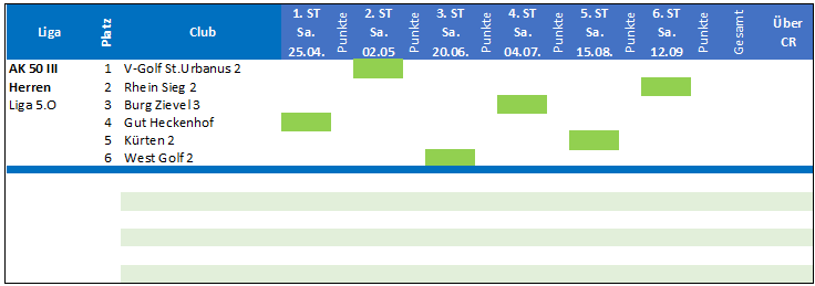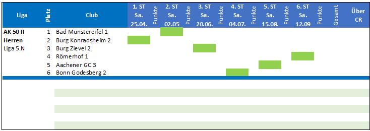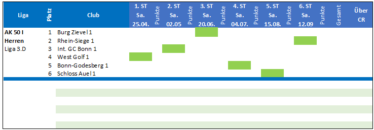 Mit dem klaren Tagessieg, mit nur 43 Schlägen über CR, wurde diese Aufgabe souverän gemeistert. Da Henri-Chapelle mit 75 Schlägen über CR nur tagesvierter wurde, konnten wir in der Tabelle den vierten Platz erobern und verbleiben somit auch im nächsten Jahr mit der AK 50 II in der 4. Liga.